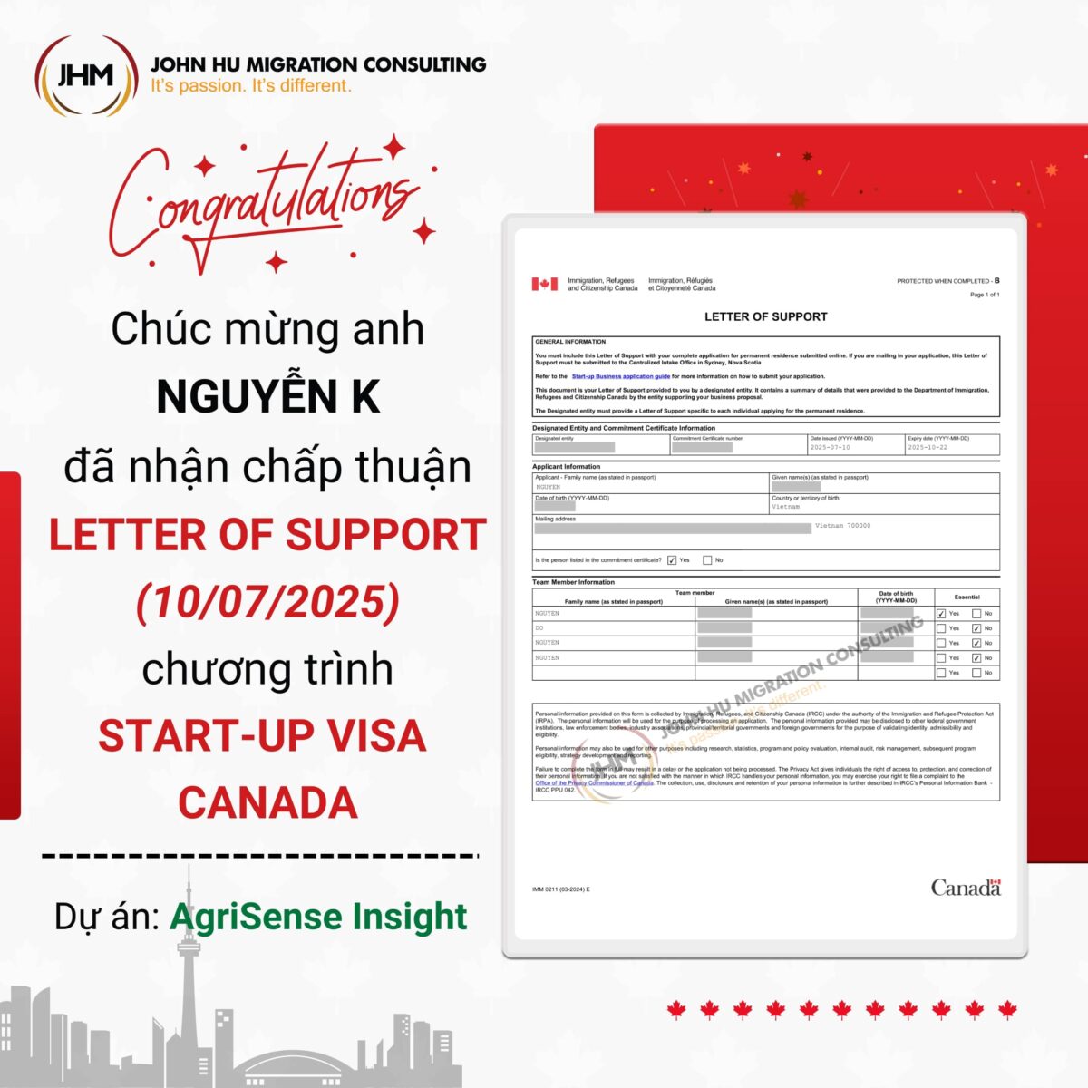 Ngày 10/07/2025 đánh dấu một cột mốc quan trọng đối với 4 nhà đầu tư thuộc dự án AgriSense Insight – khi cả nhóm chính thức nhận được Letter of Support (LOS) từ tổ chức bảo trợ, trong khuôn khổ chương trình Start-up Visa Canada.